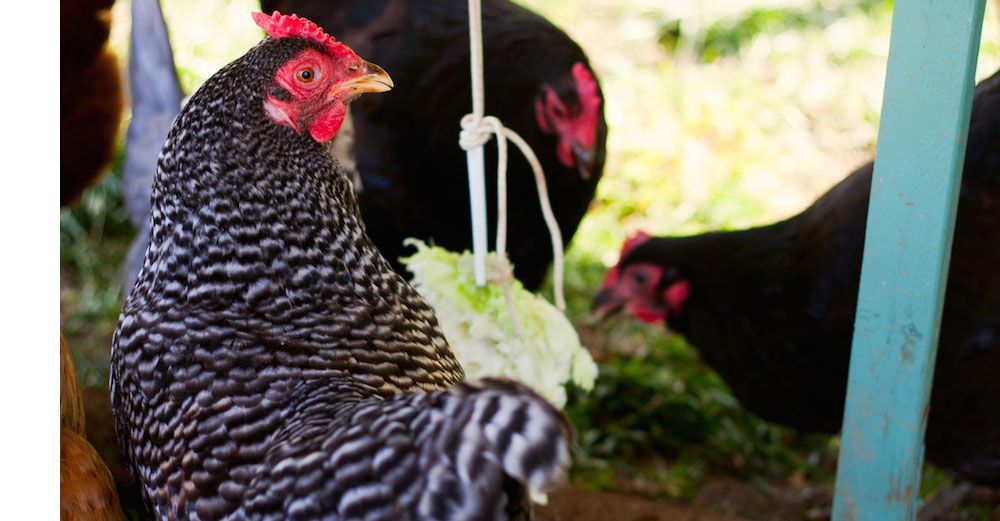 Ett vitkåls- eller sallatshuvud som man trär ett snöre igenom kan hålla hönsen sysselsatta länge.