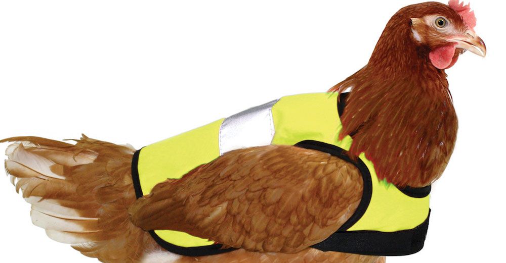 Fritt springande höns behöver ju synas i mörkret - bra att det finns reflexvästar för höns att köpa.