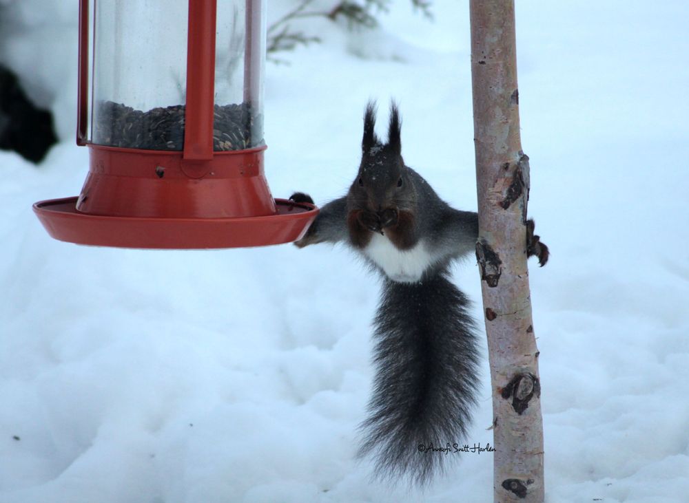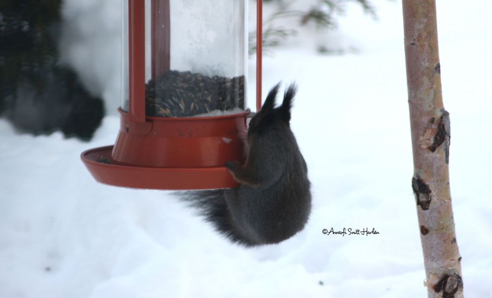 Likt en välkänd reklamfilm sträcker ekorren ut sina ben i en perfekt splitt för att nå maten i fågelmataren. Och tur för oss att Annsofi Snitt Harlén var där och kunde knäppa en bild!