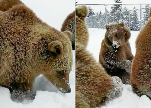 Björnarna på Orsa rovdjurspark har vaknat och leker nu i snön
