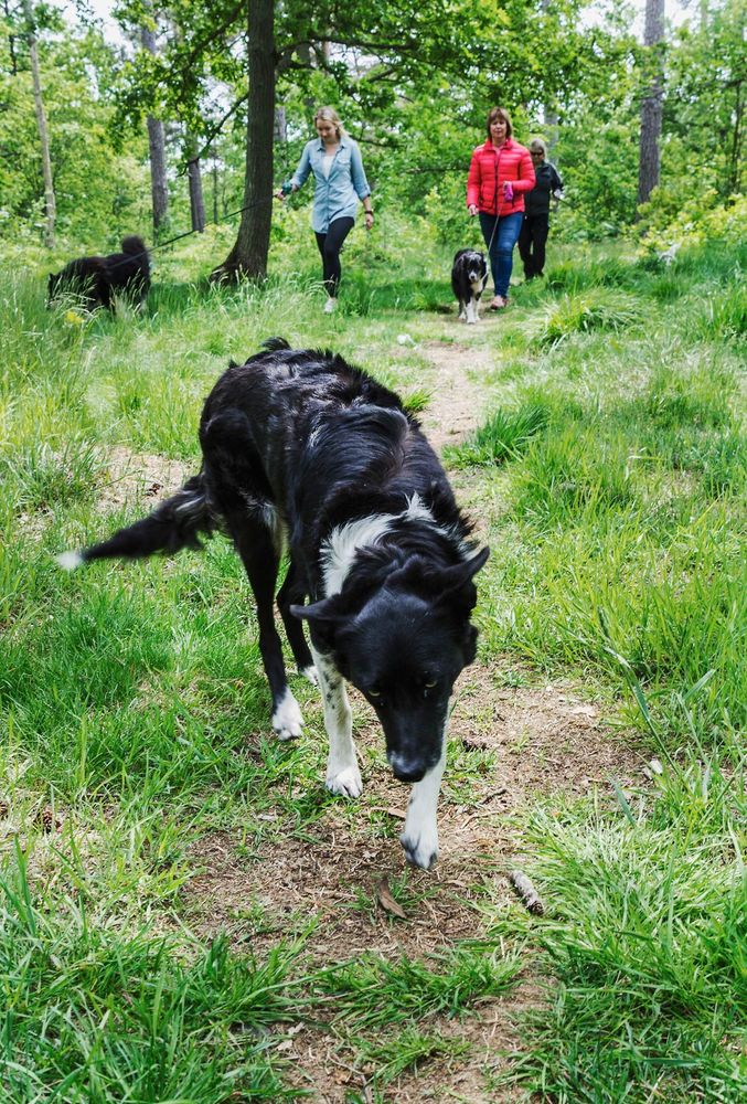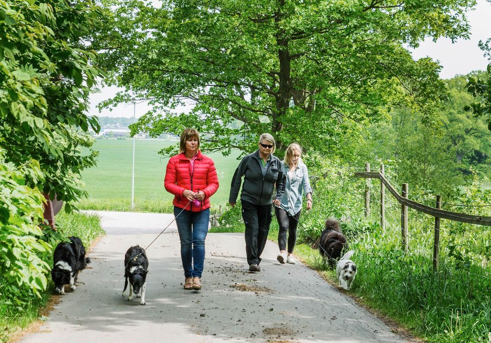 Det är dags för lunchpromenad och hundarna viftar exalterat på svansen när de släpps ut från respektive hundgård.