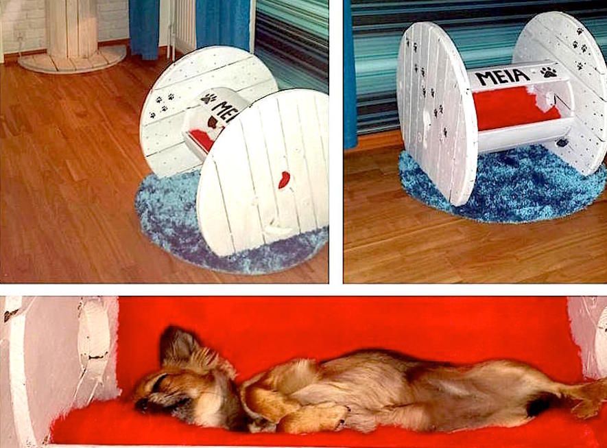 Nej, den rullar inte iväg - kabeltrumman som Anjelica Thurström i Gällivare byggt om och inrett till sin hund. För hjulen är avkapade så att den står stadigt. Fint målad med namnet och svarta tassavtryck. Klädd med mjuk dyna och rött tyg inuti.