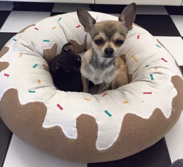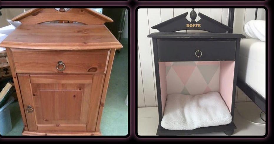 Först byggde hon om två nattduksbord till varsin mysig koja, åt sina två små chihuahuahannar Roffe och Bosse. Sen byggde om hon om två hörnskåp och inredde i lyxig stil med namnen uppepå.