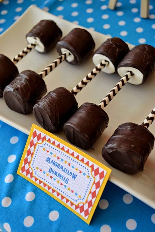 Sätt marshmallows på papperssugrör och doppa i choklad. Perfekta tyngdlyftningsstänger! Källa