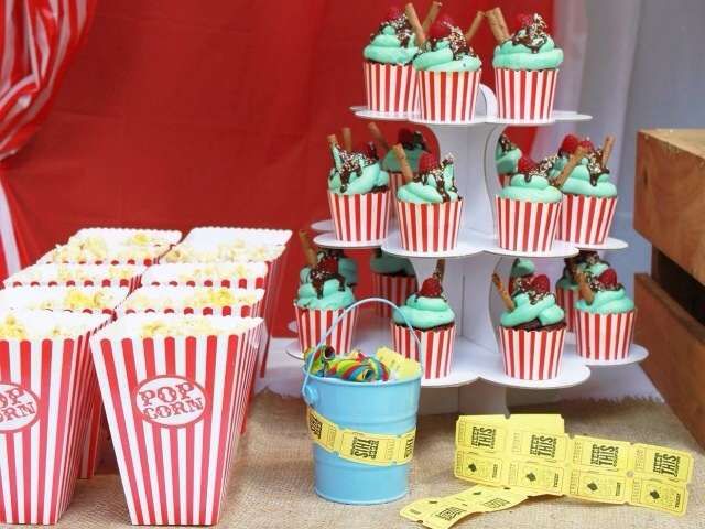 Popcornen serverar du helst i randiga pappkartonger, hittar du matchande muffinsformar så kör på! Muffinsen blir extra fina om du dekorerar dem som om de var mjukglassar, med kex och körsbär på toppen. Källa