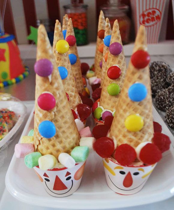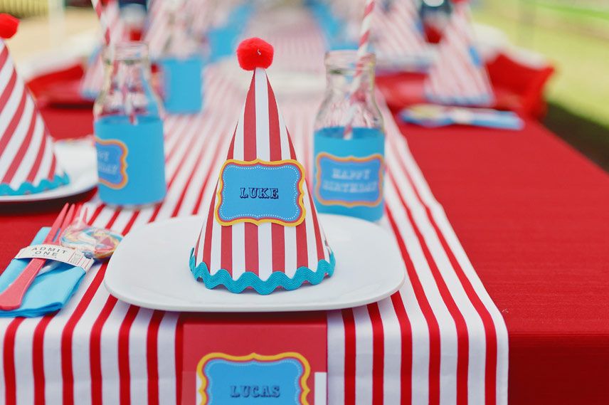 Med rött, blått och ränder gör du cirkus på nolltid. Dekorera gärna med röda pompoms i olika storlekar för att hylla clownnäsan! Källa