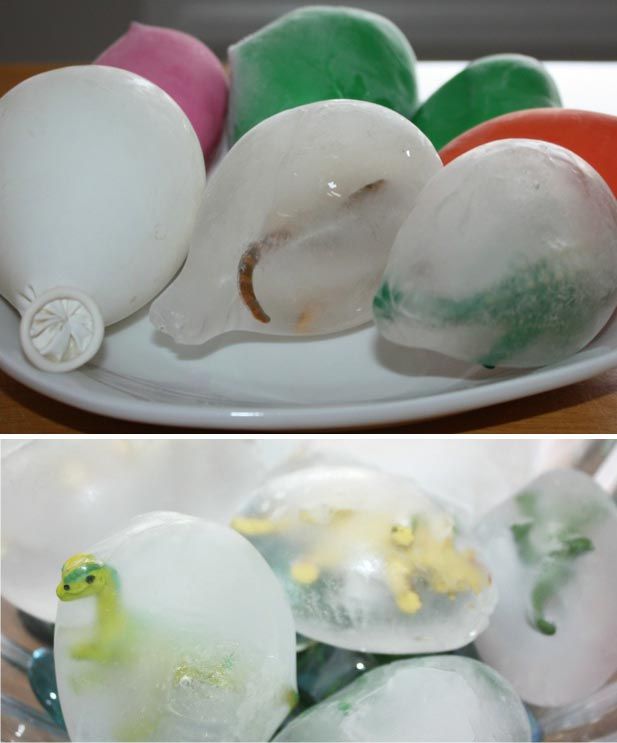 Stoppa in små dinosaurier i ballonger, fyll på med lite vatten och frys in. Använd till att kyla dryck eller låt barnen få smälta fram dinosaurierna med hjälp av pipetter med varmt vatten. Källa