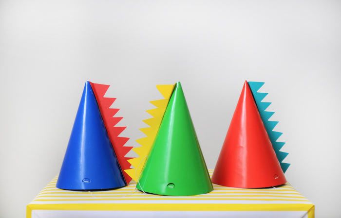 Med dinosauriepimpade partyhattar blir festen extra rolig. De här gör du enkelt av kraftigt papper. Källa