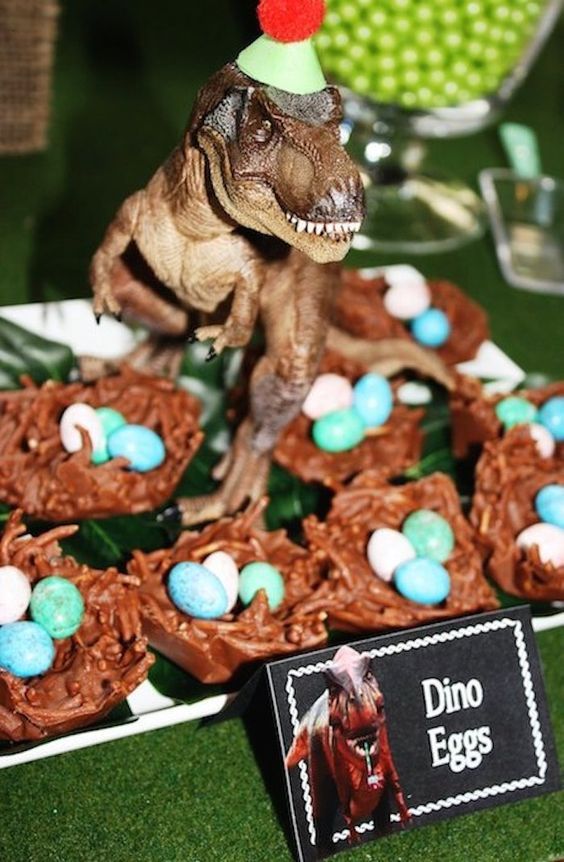 De här bedårande dinosauriebona borde du kunna göra av cornflakeskonfekt och färdiga godisägg. Superroligt snacks! Källa