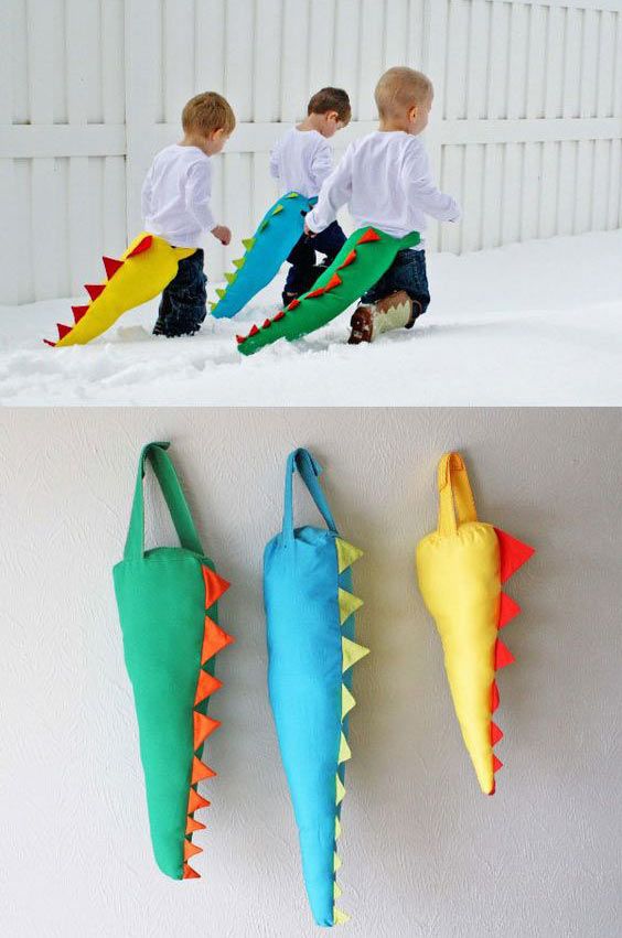 Okej, de här tar lite tid att göra men visst är de fantastiska? Sy upp och fäst runt stolarna vid bordet och låt sedan de små dinosaurierna sätta på sig dem! Här hittar du utförliga instruktioner om du vill sy dem.