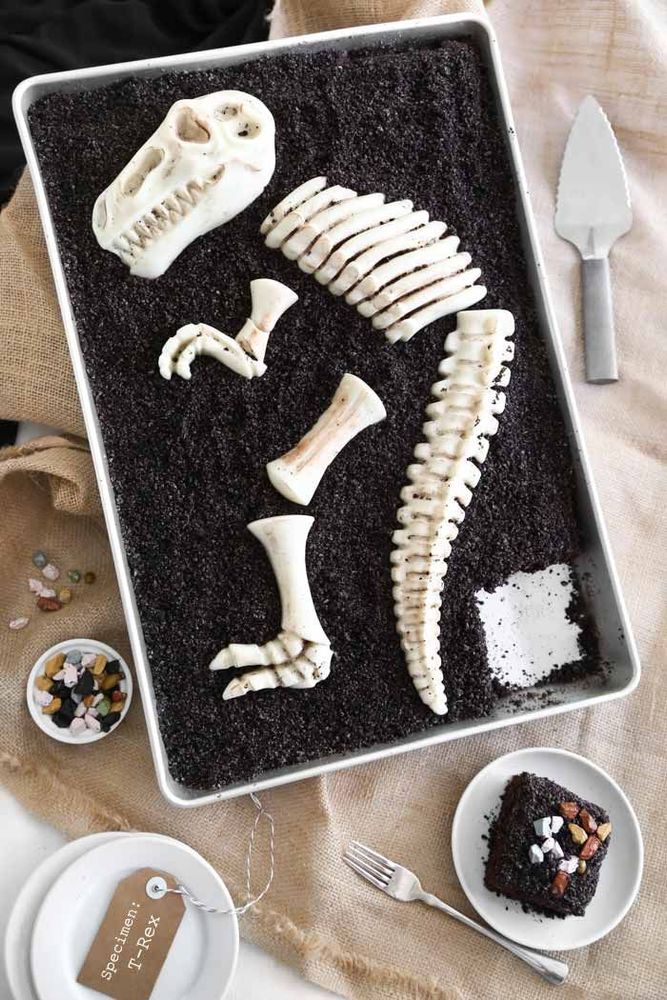 Den här tårtan ser så mycket svårare ut än den är, egentligen är det bara en chokladkaka som fått ett glasyr och pulvriserade Oreo-kakor över sig. Det bygger lite på att du kan få tag på en form för själva skelettet, men de ska finnas som sandformar för sandlådan! Här är hela receptet (på engelska).