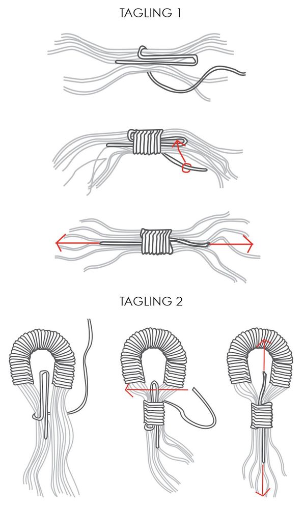 Taglingen görs på mitten av ett knippe långa trådar, långa nog att räcka till det arbete man tänkt sig. När taglingen är klar fortsätter arbetet med att knyta makramé, till exempel en ampel eller ett armband.