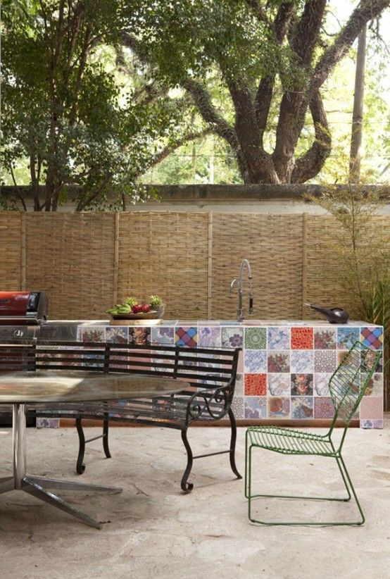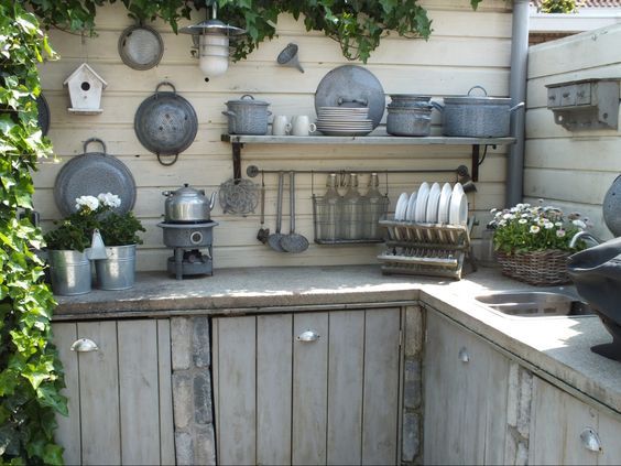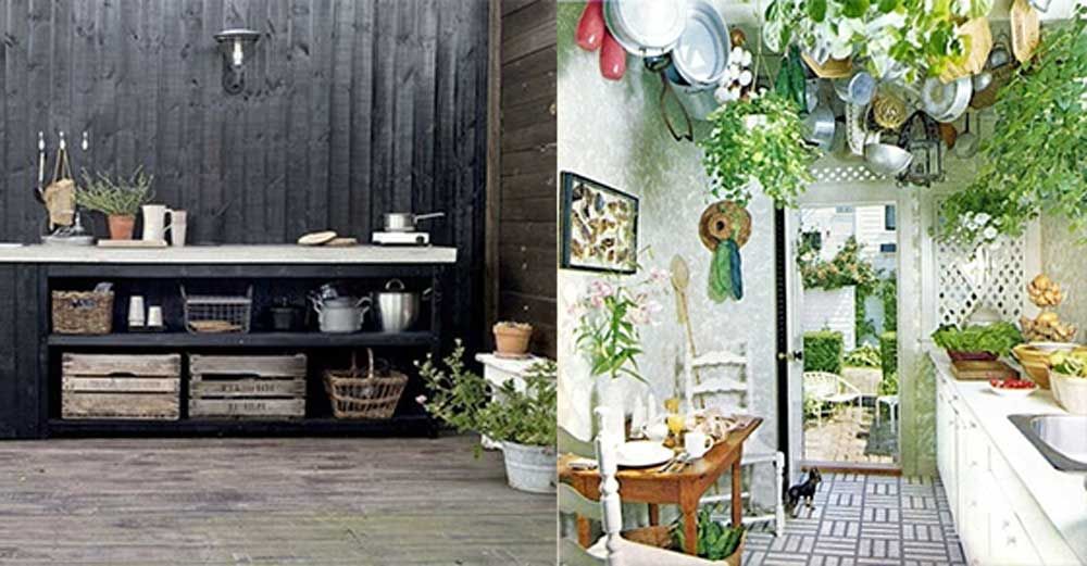 Grönskande inbyggt sommarkök. Balkarna i altantaket används för upphängning av redskap och växter. Källa