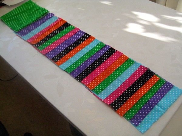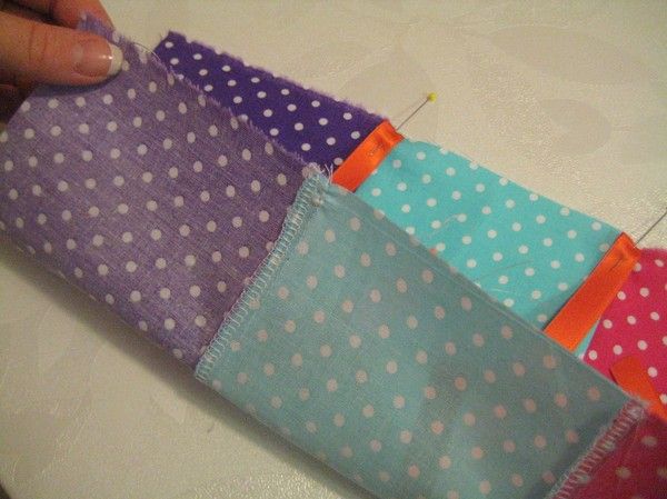 5. Klipp upp satinbandet i 24 lika långa bitar och nåla fast banden i sömmen i varje skarv.
