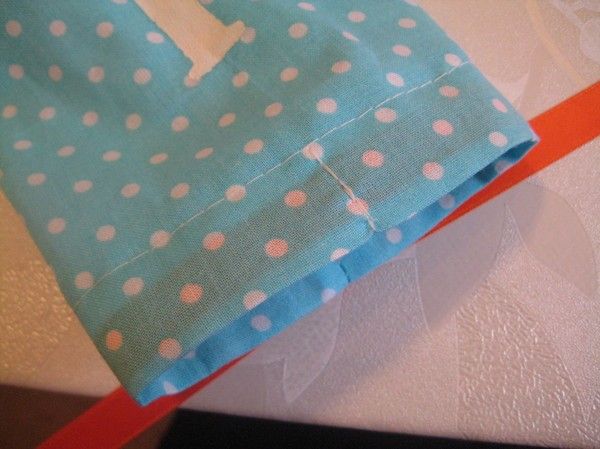 8. ”Lucka” ett fållas nertill för att kunna dra in ett band så att även den kan stängas. Lämna ett litet hål i sömmen så att bandet kan komma ut och knytas ihop.