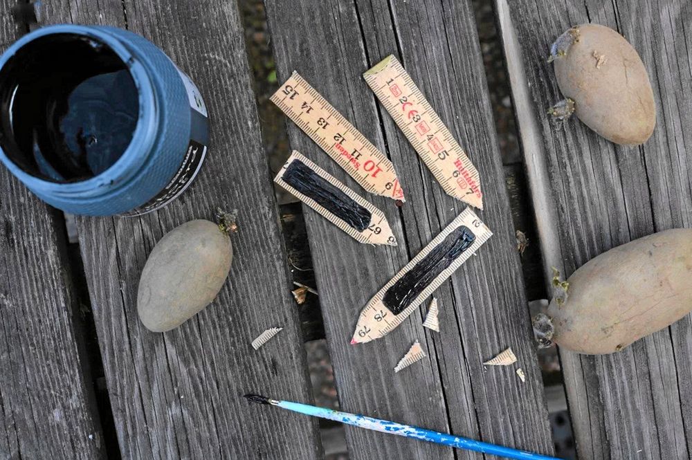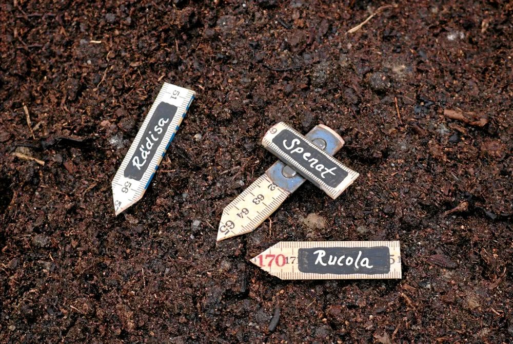 Odlingsskyltar är bra att ha så man vet vad man odlat var. Charmigaste odlingsstickorna gör du av en gammal tumstock.