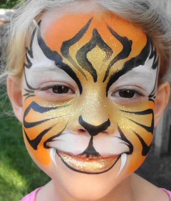 Att måla en tiger är inte så svårt som man kan tro. Lägg först grundfärgen med en svamp, vitt ovanför ögonen och under näsan. Orange och gult i resten av ansiktet. Måla sedan dit de svarta linjerna och en nos. Bilden kommer från pinterest.com.