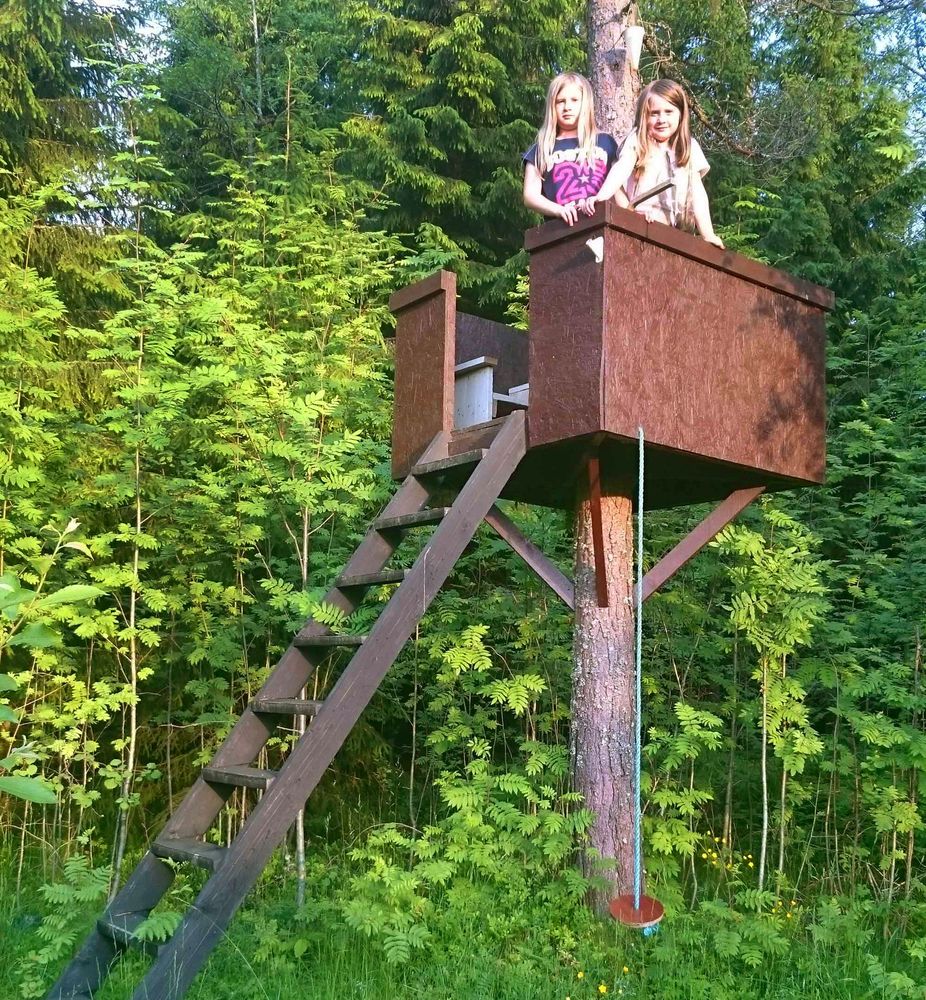 3. Linda och Malins koja på hög höjd med bänkar runt stammen och gunga under