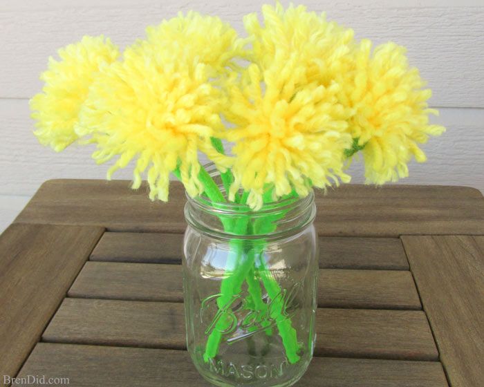 Garn och piprensare blir maskrosor! Bilden kommer från brendid.com där det finns utförliga instruktioner på hur du lindar garnet till maskrosor.