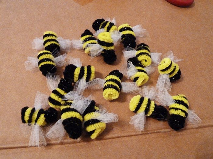 Gul och svart piprensare med små bitar av tyll blir bin! Bilden kommer från snacksthepegasus.blogspot.se.