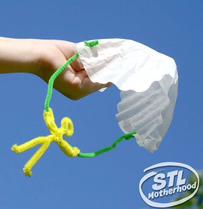 Själva fallskärmen är tillverkad av ett kaffefilter, på stlmotherhood.com finns utförligare instruktioner.
