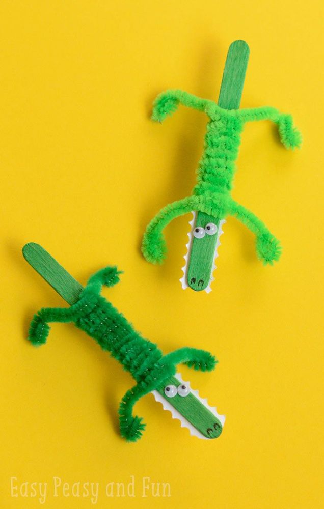 Med piprensare, hobbyfärg, hobbyögon och lite papper som du klipper med en sicksacks-sax förvandlar du enkelt vanliga glasspinnar till krokodiler! Bilden kommer från easypeasyandfun.com där det också finns utförligare instruktioner.