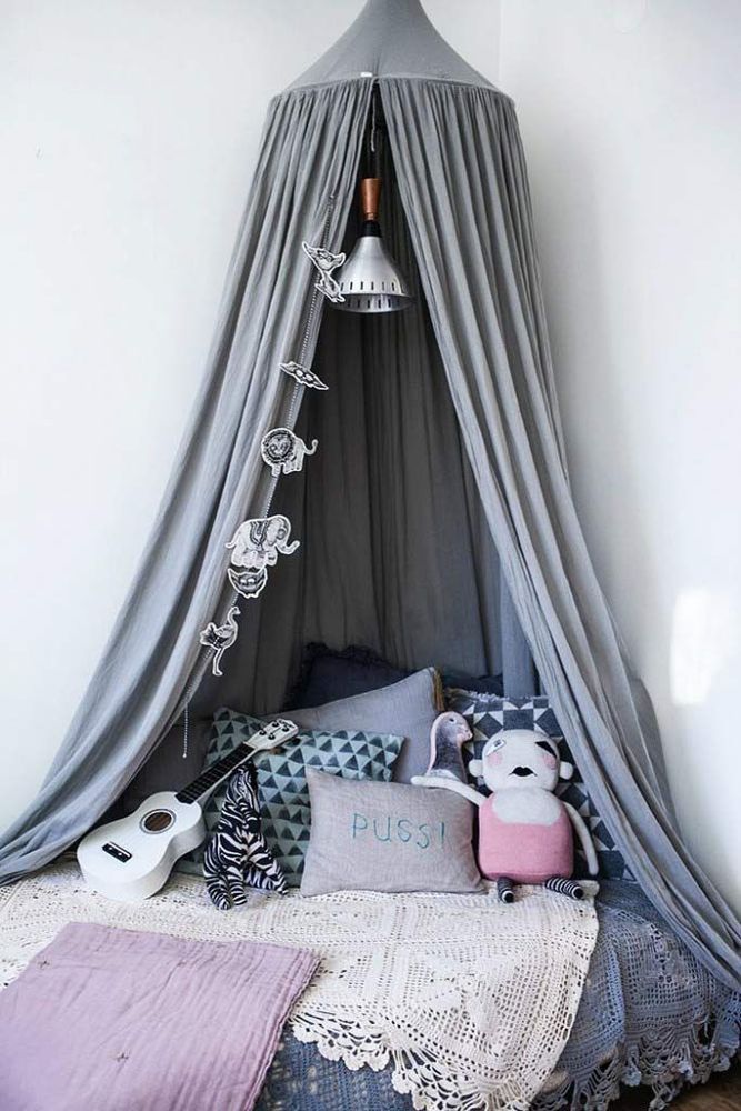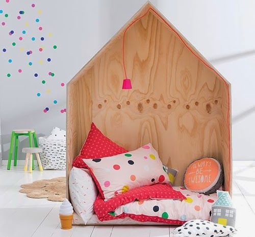 Använd stuvbitar och gör ett färgglatt tipitält i barnrummet. Med kuddar och trasmatta blir det riktigt mysigt! Källa