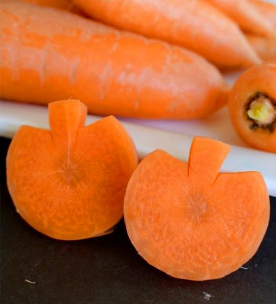 Skär ut två små trekanter från en hel morot och spar på ett skaft mellan trekanterna. Skär sedan upp hela moroten.