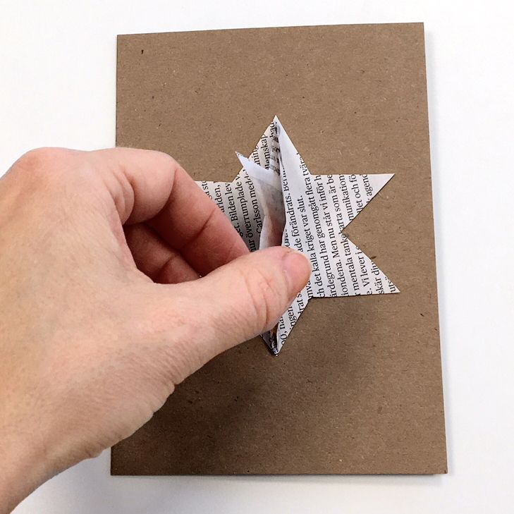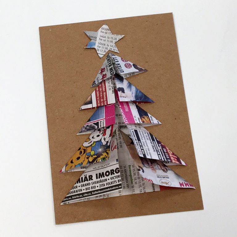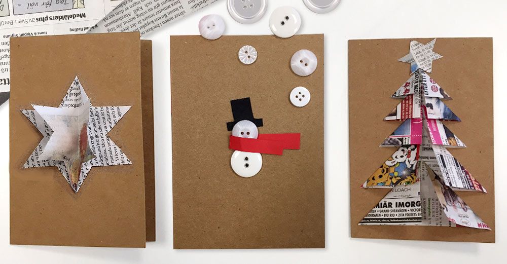 Enkla julkort gör du lätt själv. Pappret behöver inte vara dyrt och glansigt, det blir lika fint med vanligt tidningsapper.