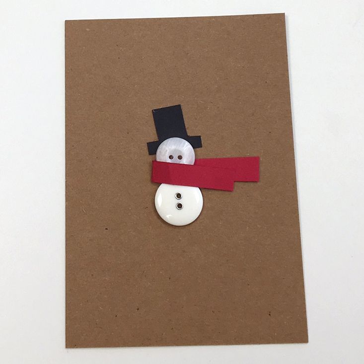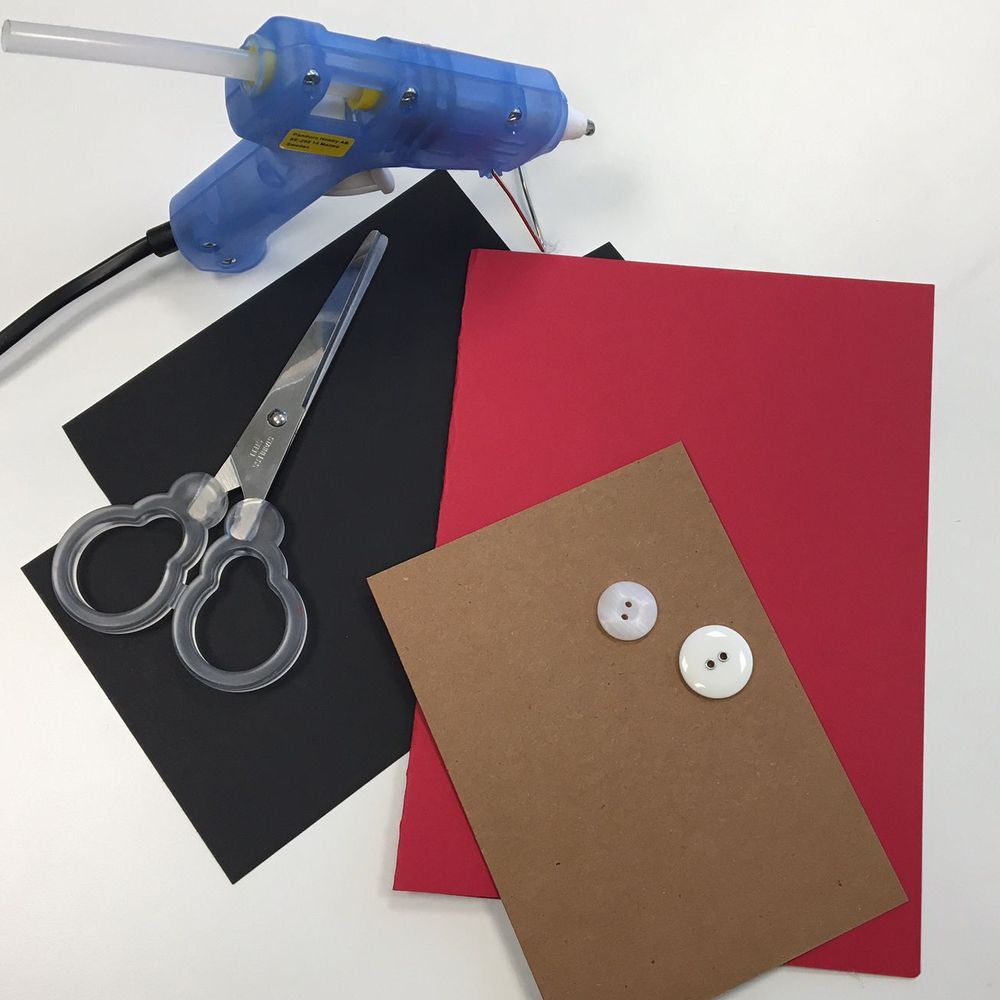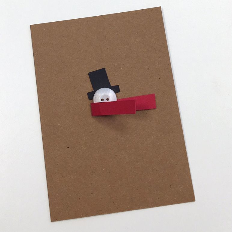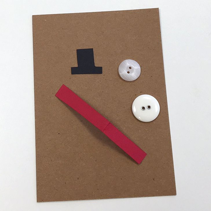 Det kan vara enklast att limma hatten och halsduken först, sedan på med knapparna.
