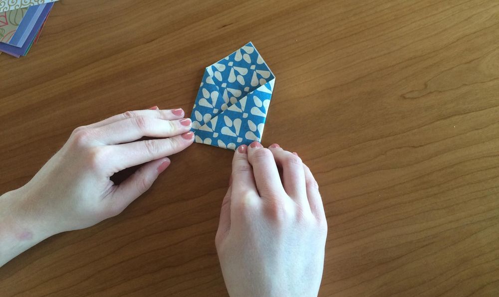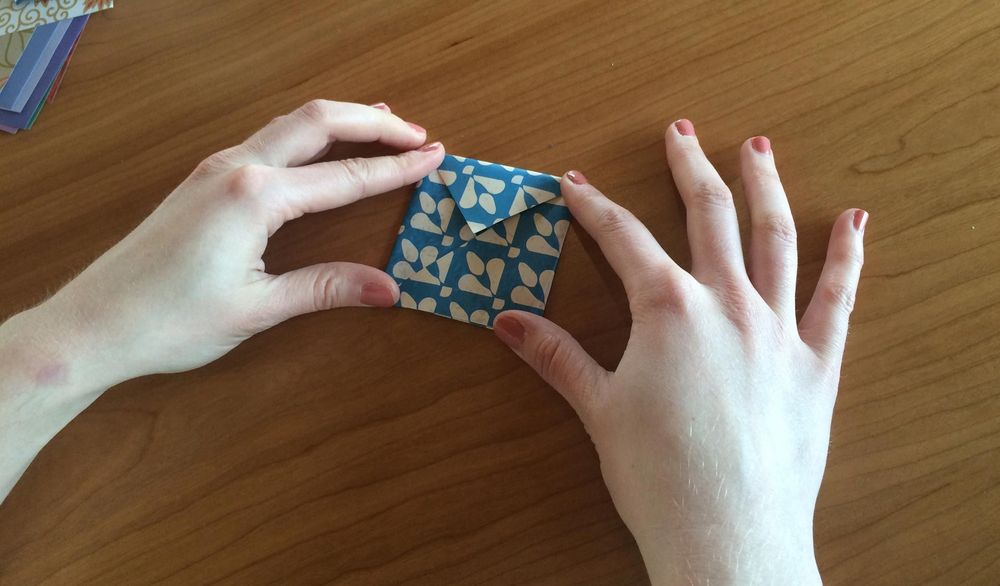 4. Vik det andra hörnet över det första. För sedan in fliken i den första flikens öppning. Lirka tills båda hörnen är jämnt placerade, så att det ser ut som ett uppfällt kuvert. Pressa till kanterna.