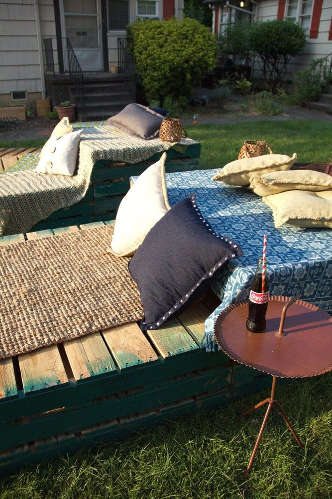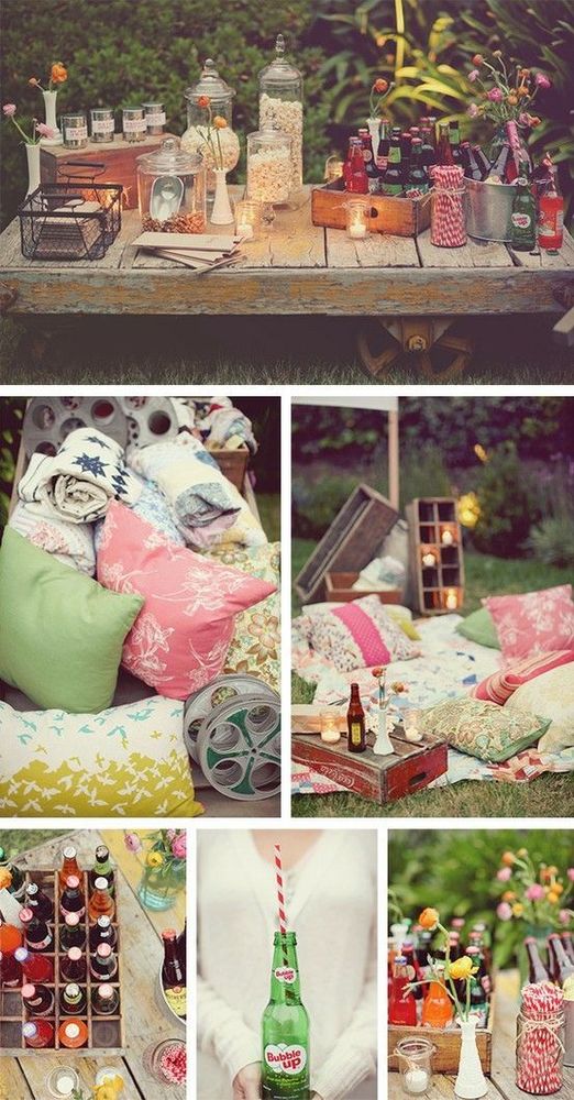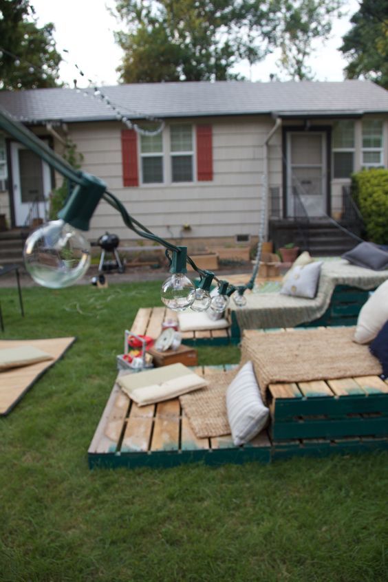 Lägg ut massor av filtar och kuddar. Häng upp belysning och pompoms i träden. Bildkälla