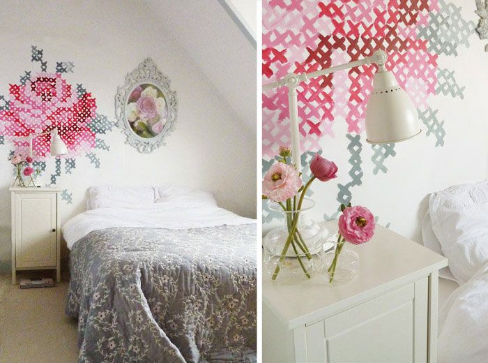 Om du gillar hantverk är en korsstygns-dekoration något för dig! Rita upp ett rutmönster med blyerts, hitta ett mönster och gå loss med penseln! Bilden kommer från bloesem.blogs.com.