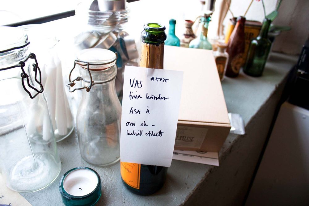 I fönstret står den senaste beställningen, en tom champagneflaska med en lapp dinglande om halsen: ”Vas, fria händer – om OK, behåll etikett.”