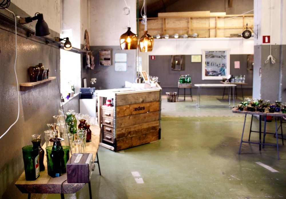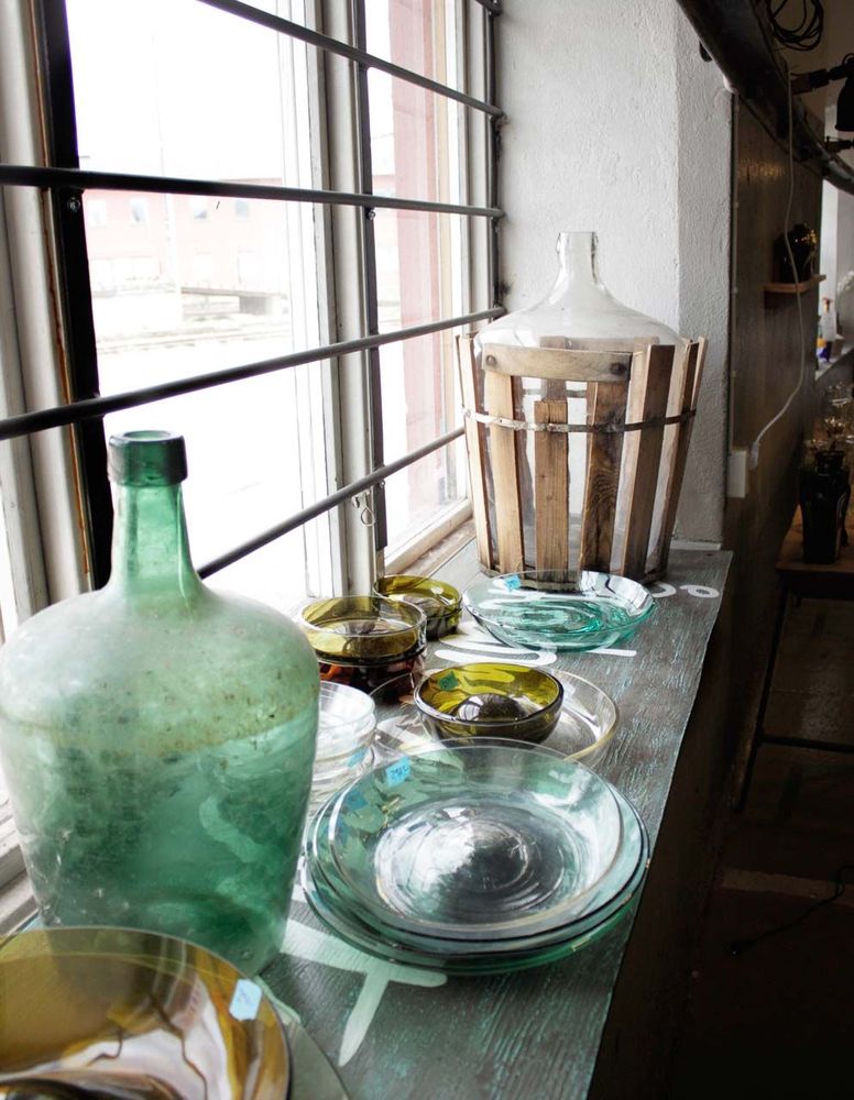 På borden står smäckra gröna vaser med svängiga glasvolanger. I hyllorna intill rader av vackra och roliga glas gjorda av öl- och spritflaskor från när och fjärran. Ofta prydda med originaletiketter.