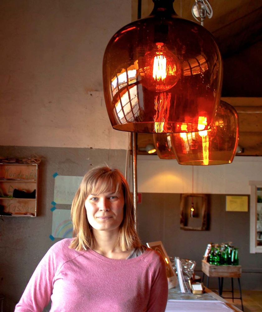 Hon balanserar på en stege med en bumling till lampa i famnen. Det är ett av hennes mest populära alster: bärnstensskimrande glaskupor gjorda av damejeanner, stora glaskärl, som ska hängas upp.