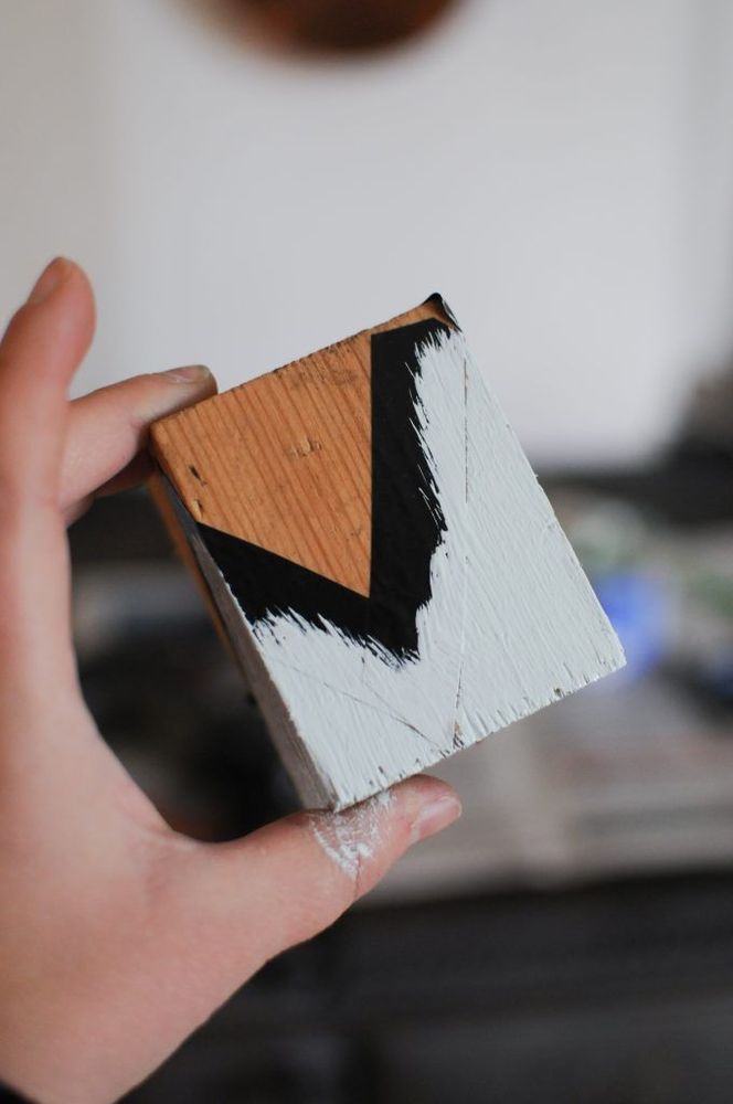 Hon har tejpat med tjock tejp för att göra mönstret på träbiten.