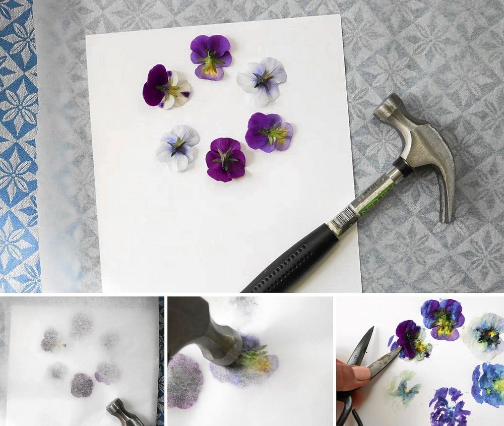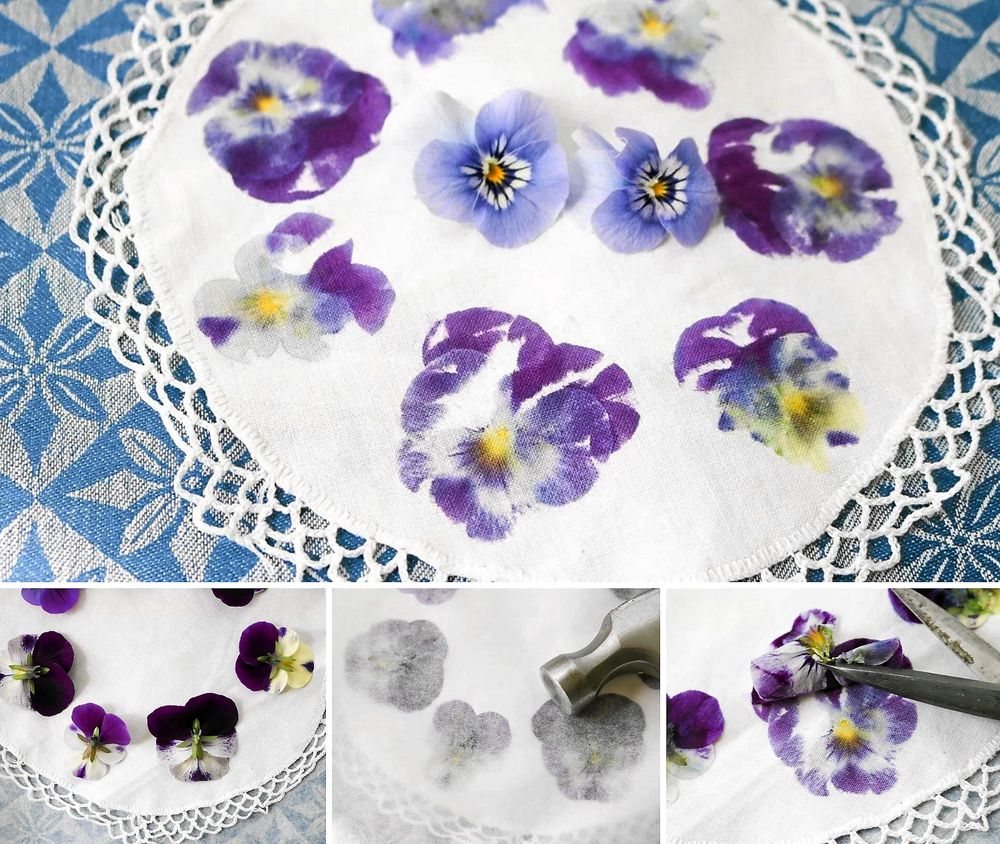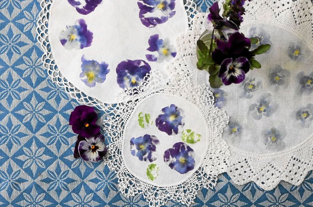 Ska du trycka på tyg så testa gärna först att göra blomtryck på ett grövre papper, för att se hur hårt du behöver hamra på blommorna för att de ska bli ett tryck. Penseér blir så fint tryck eftersom de har vackra linjer i mitten på blommorna.