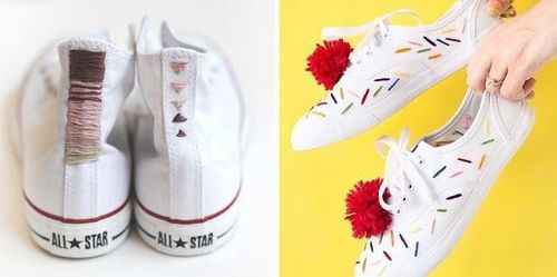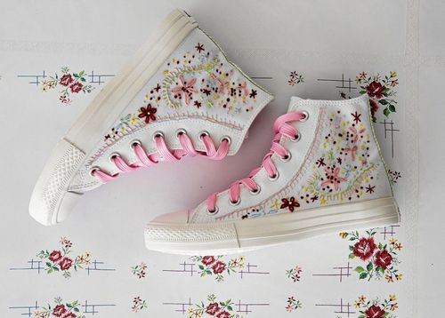 Sommarens roligaste pyssel och finaste festsko på samma gång. Brodera blommor och krusiduller på en vit bomullsdoja.