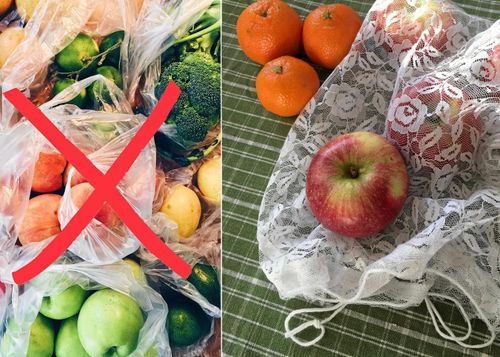 Hej då, dumma prasselpåse! Med en hemsydd fruktpåse i spets kan du handla frukt och grönt helt utan plast.