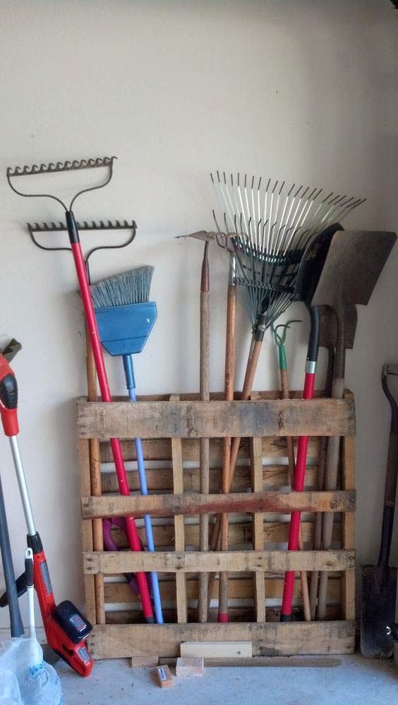Skruva fast en lastpall i väggen och förvara trädgårdsredskapen där! Källa