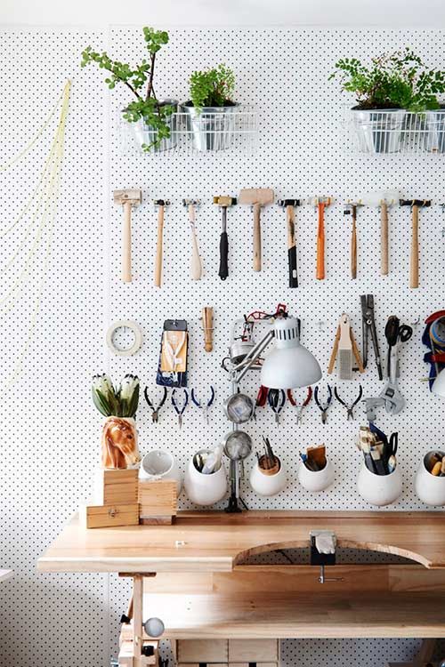 Om du får in lite solljus i garaget kan du sätta några krukor i korgar på väggen. Rummet blir mer levande! Källa