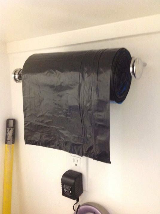 Använd en vanlig hållare för hushållspapper och häng en rulle sopsäckar på den! Källa