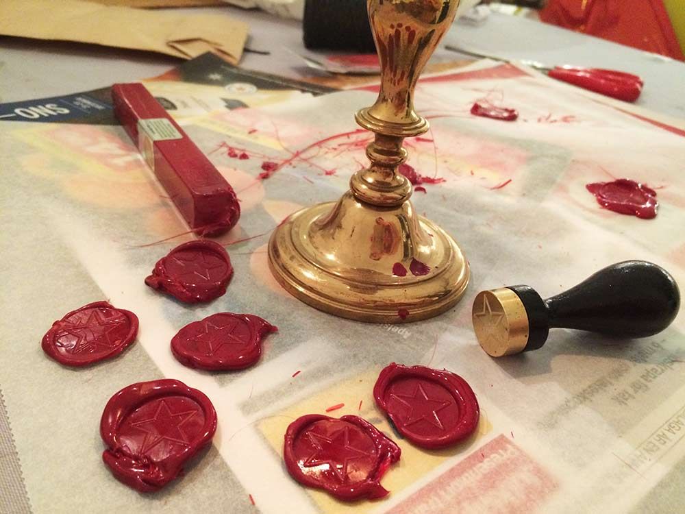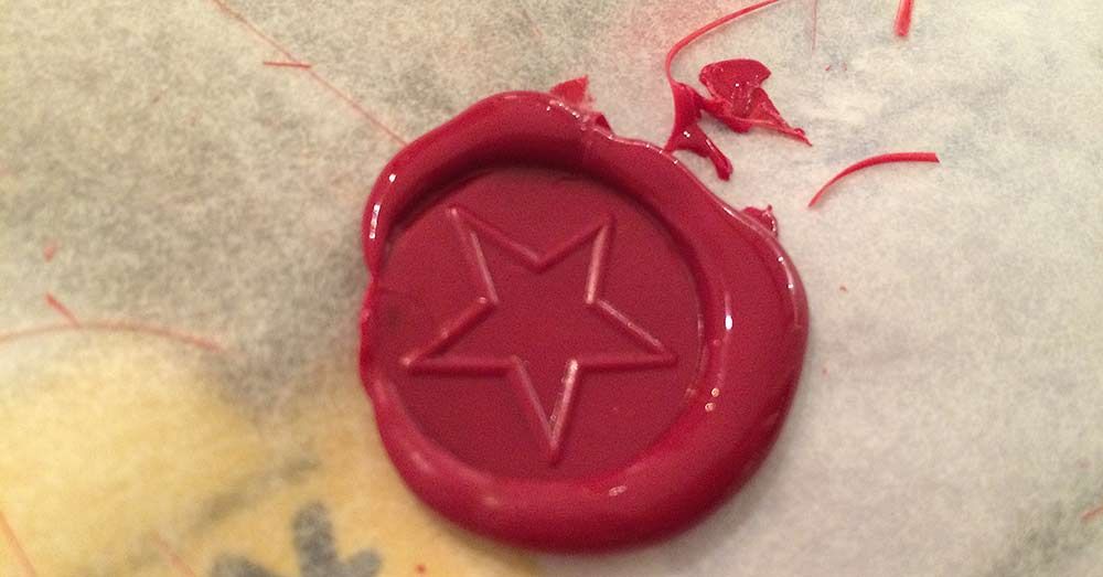 3. När lacket är varmt och lite rinnigt, tryck det mot bakplåtspappret. Upprepa några gånger på samma ställe innan du trycker dit stämpeln (eller myntet).