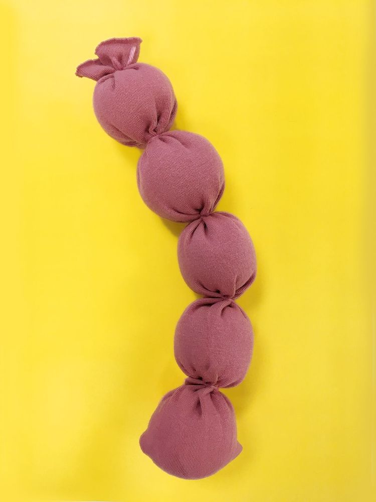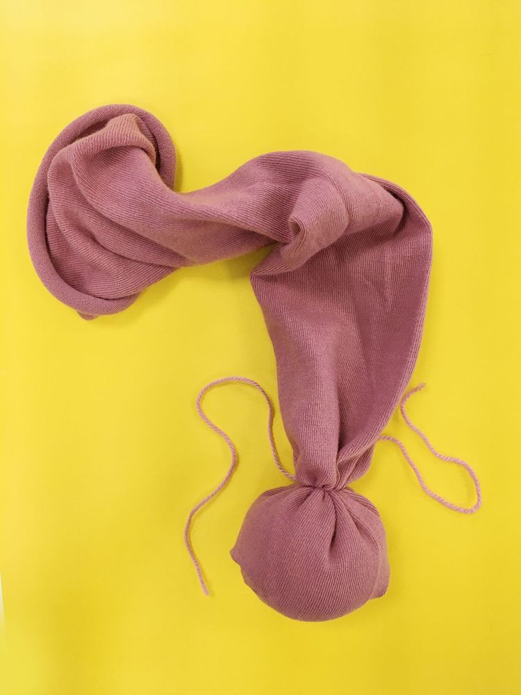 Ta en näve vadd och stoppa in i strumpan, fyll på med så mycket vadd som du vill att huvudet ska vara stort. Knyt åt med ett garn i passande färg, eller ta en gummisnodd och snurra runt.