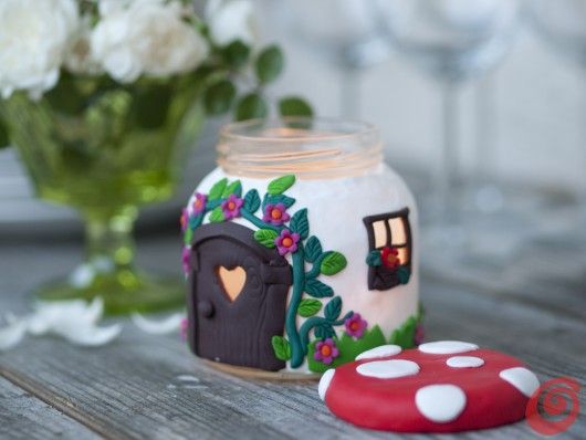 En vanlig glasburk har målats vit och dekorerats med hobbylera. Med ett batteridrivet värmeljus blir det liv i burken! Bilden kommer från den italienska sajten casatrend.it, där det också finns fler bilder.