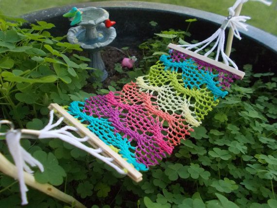 Virka en liten hängmatta och fäst i rabatten med blompinnar. Perfekt häng för älvor! Bilden kommer från etsy.com där du också kan köpa underverket.
