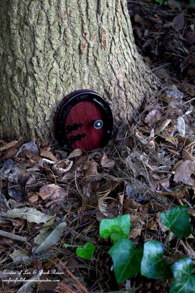 En hästsko är basen i den här lilla dörren. Den har spraymålats svart tillsammans med små dekorativa gångjärn. Själva dörren är i trä, komplettera med en liten, liten knopp och klistra ihop hela härligheten. Fullständiga instruktioner finns på bloggen ourfairfieldhomeandgarden.com