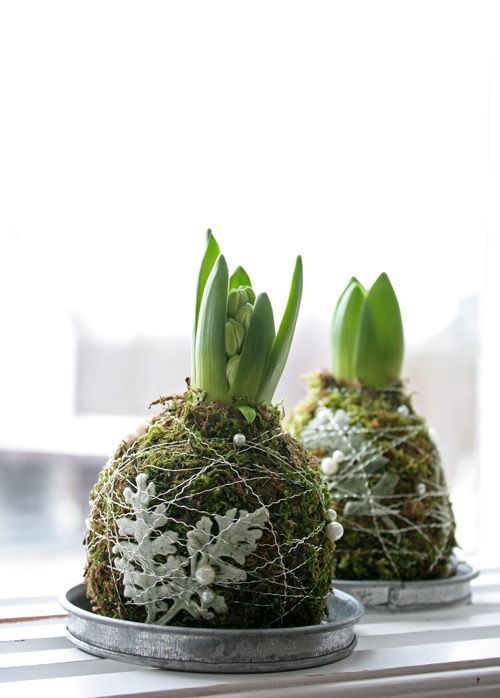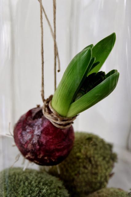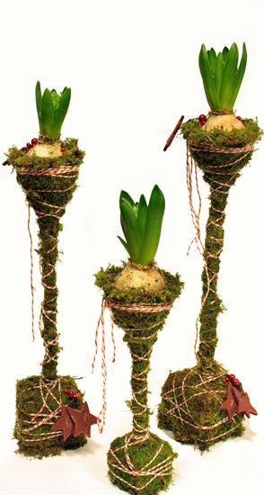 Låt lökarna sväva i var sitt snöre en bit ovanför mossan. Det blir ett roligt jularrangemang för fönstret även om det inte håller så länge. När löken växer till sig behöver den sätta rötterna i jorden.