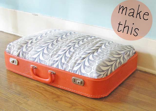 Den här hundsängen är väldigt enkel att göra, du behöver bara lite verktyg en resväska, en kudde och ett kuddfodral! På moxandfodder.com finns utförligare instruktioner.